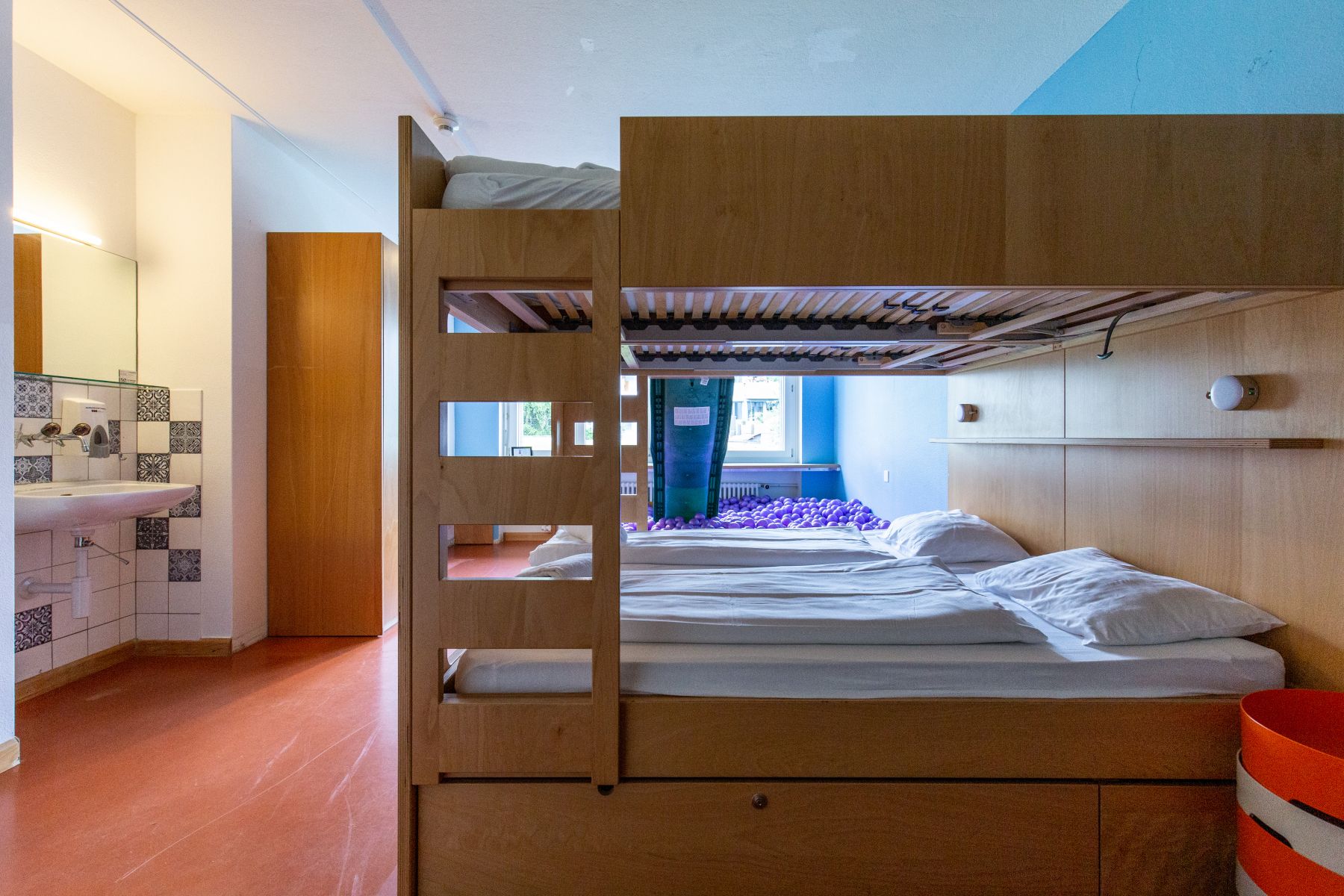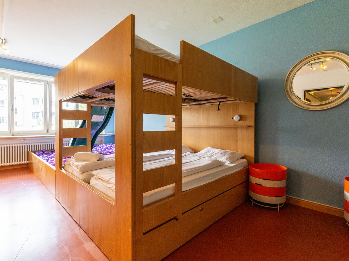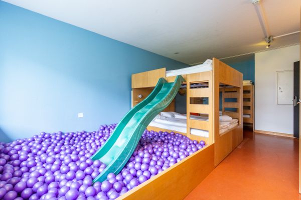 Unser Familienzimmer mit sechs Schlafplätzen für die ganze Familie inkl. Rutsche in das Bällebad