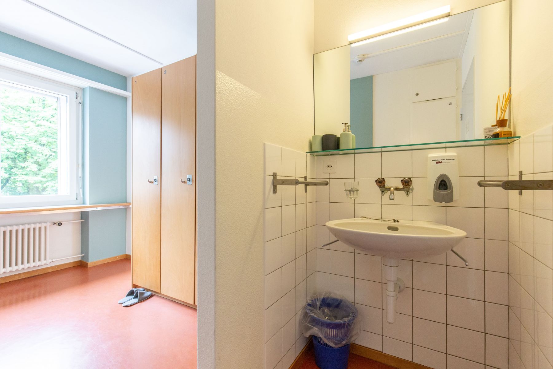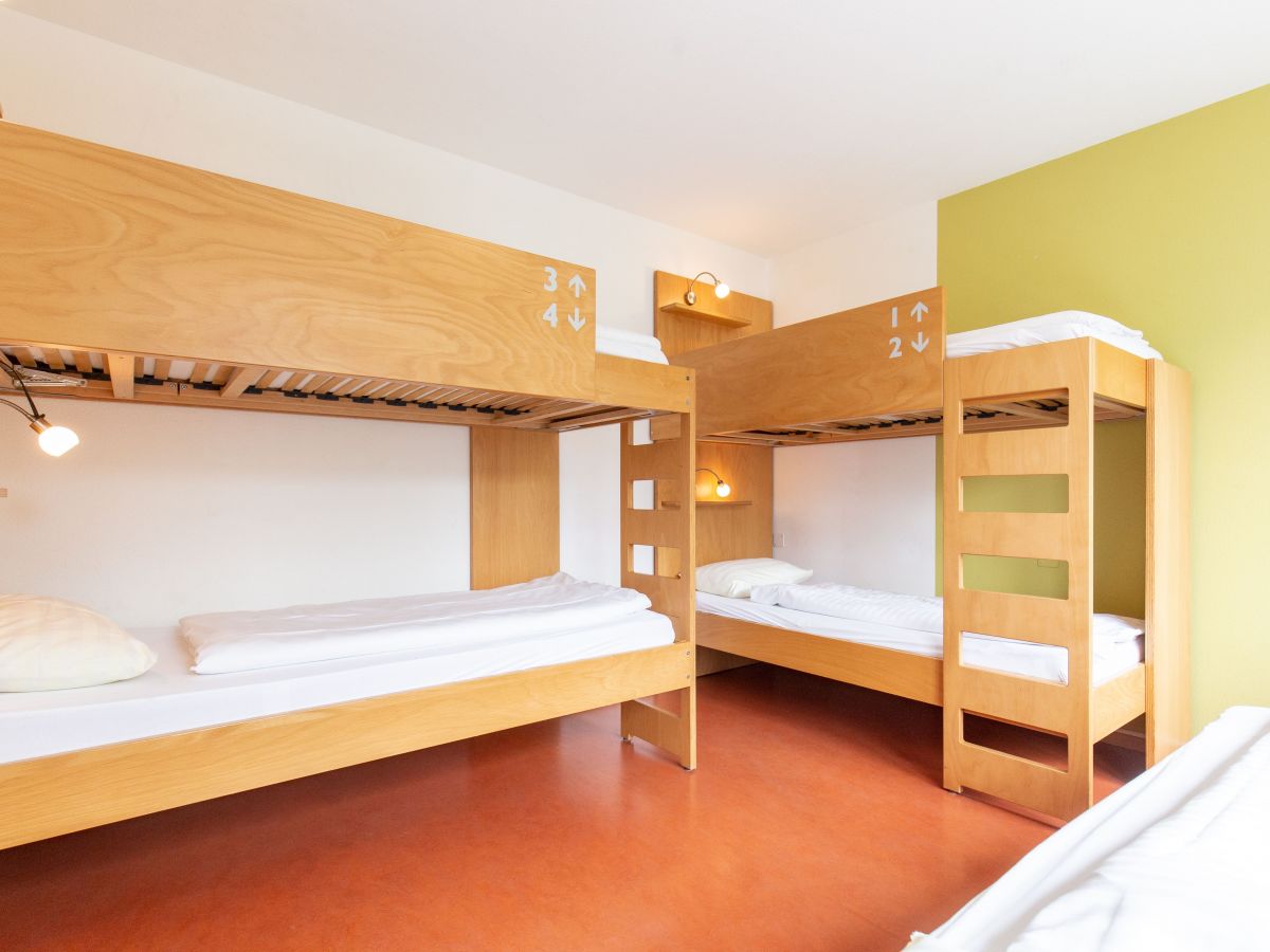 Als Gruppe oder Familie übernachtet ihr in einem geräumigen Zimmer mit drei Stockbetten. Das Zimmer verfügt über ein Waschbecken und auf der Etage stehen euch ein Gemeinschaftsbad und ein WC zur Verfügung. Im Hyve pflegt ihr aber auch den Austausch mit anderen Gästen und unserer Community.