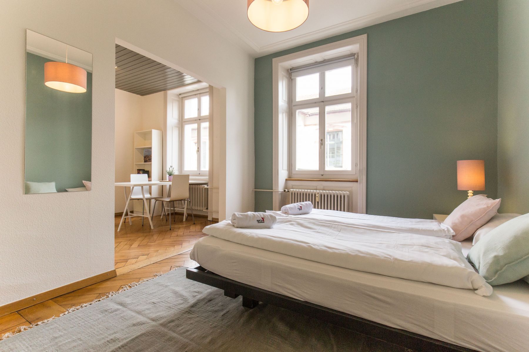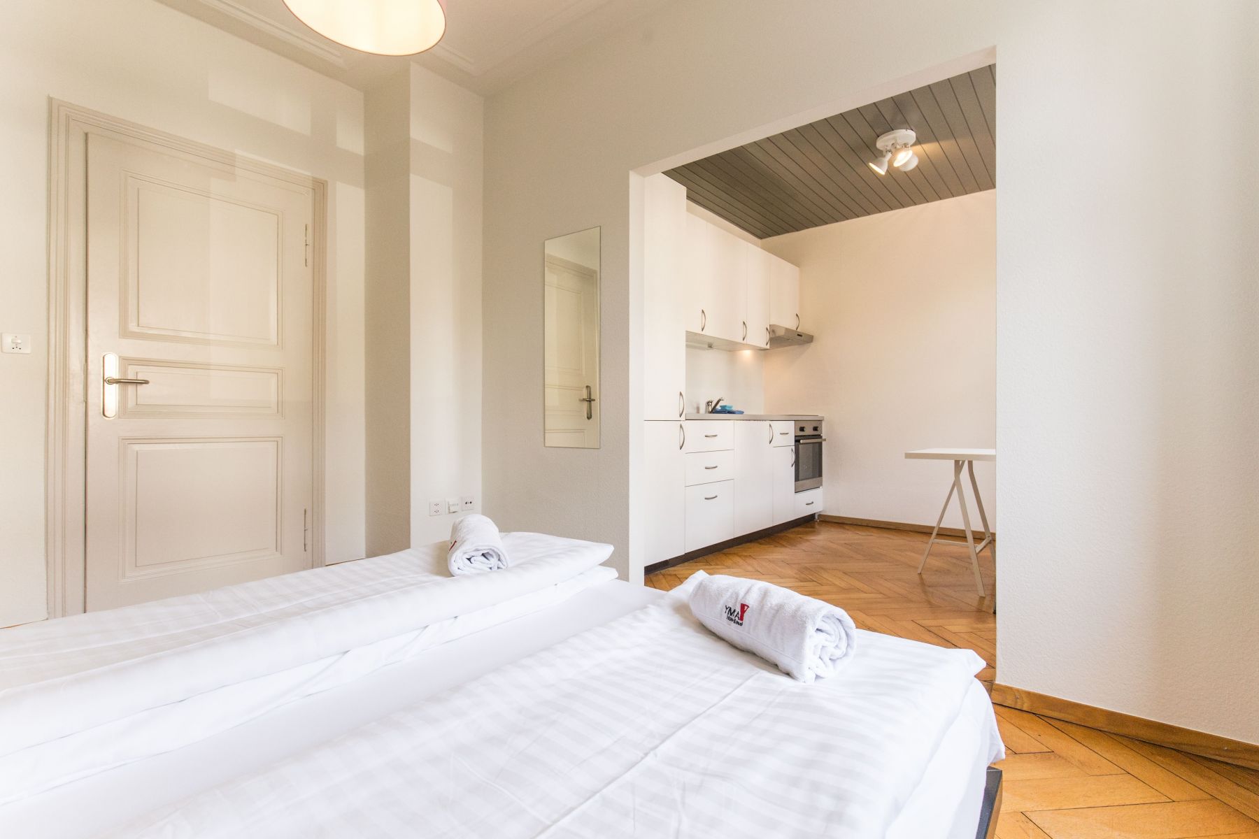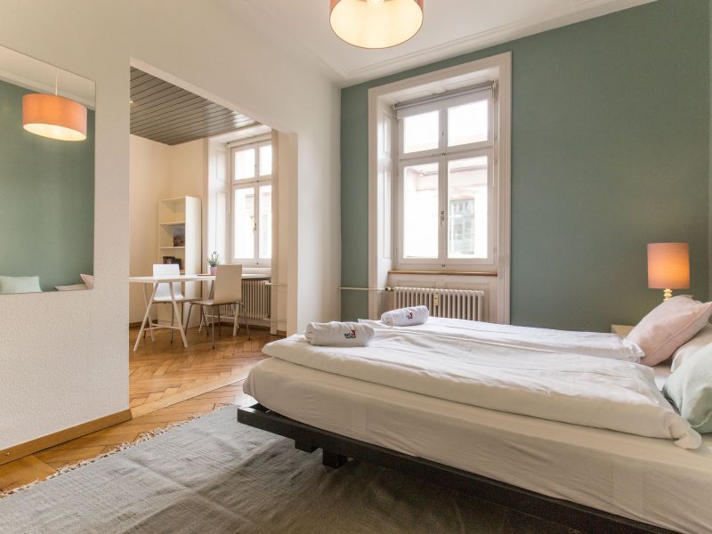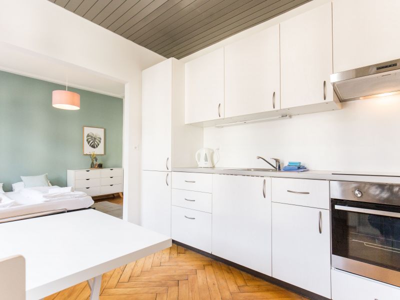The spacious studio which can accommodate up to two people. It has a double bed, a fully equipped kitchen, a lounge area and shared bathroom.